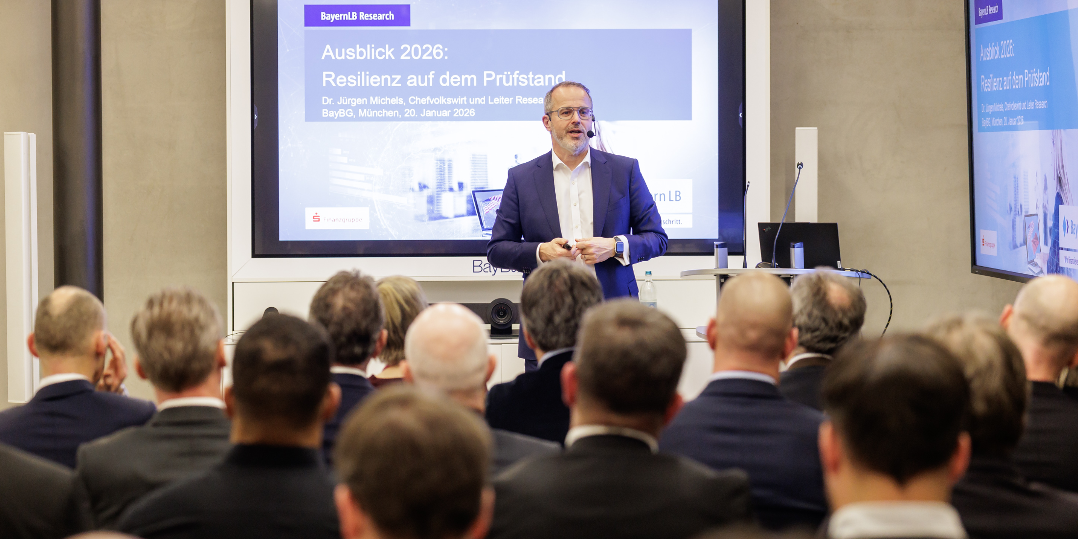Welche Faktoren die wirtschaftliche Entwicklung im Jahr 2026 maßgeblich beeinflussen, erläuterte Jürgen Michels, Chefvolkswirt der BayernLB, beim Jahresauftakt der BayBG in München.